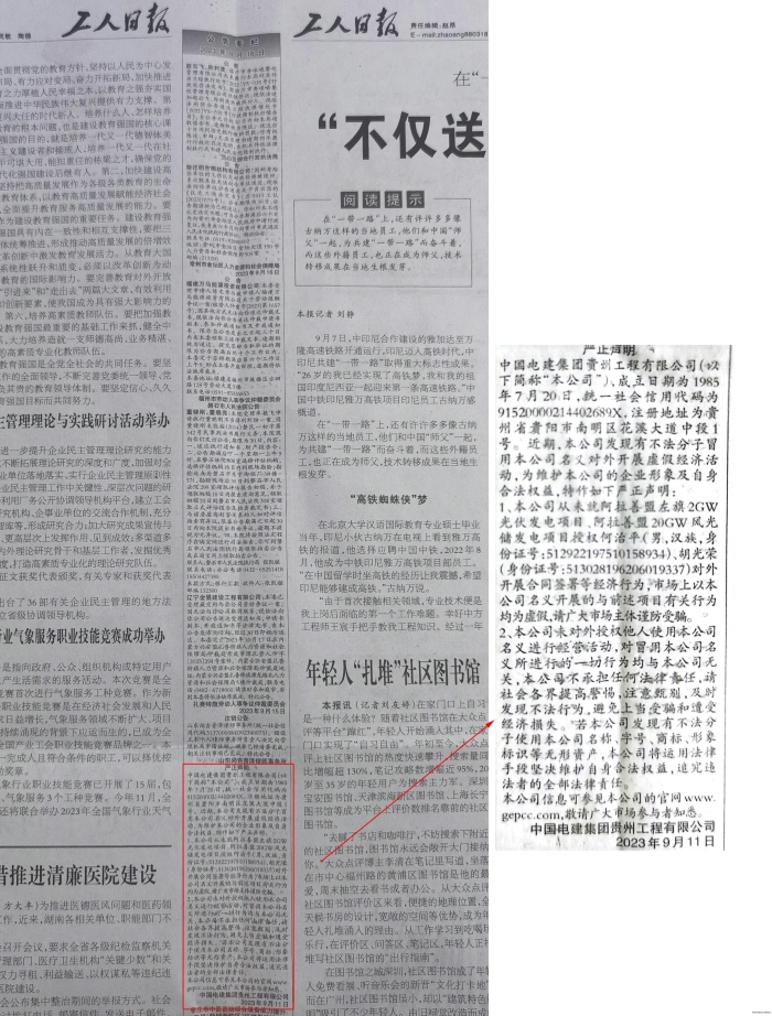 中國電建集團貴州工程有限公司(以下簡稱“本公司”),成立日期為1985年7月20日,統(tǒng)一社會信用代碼為91520000214402689X,注冊地址為貴州省貴陽市南明區(qū)花溪大道中段1號。 近期,本公司發(fā)現有不法分子冒用本公司名義對外開展虛假經濟活動,為維護本公司的企業(yè)形象及自身合法權益,特作如下嚴正聲明: 1、本公司從未就阿拉善盟左旗2GW光伏發(fā)電項目、阿拉善盟20GW風光儲發(fā)電項目授權何治平(男,漢族,身份證號:512922197510158934)、胡光榮(身份證號:513028196206019337)對外開展合同簽署等經濟行為,市場上以本公司名義開展的與前述項目有關行為均為虛假,請廣大市場主體謹防受騙。 2、本公司未對外授權他人使用本公司名義進行經營活動,對冒用本公司名義所進行的一切行為均與本公司無關,本公司不承擔任何法律責任,請社會各界提高警惕,注意甄別,及時發(fā)現不法行為,避免上當受騙和遭受經濟損失。若本公司發(fā)現有不法分子使用本公司名稱、字號、商標、形象標識等無形資產,本公司將運用法律手段堅決維護自身合法權益,追究違法者的全部法律責任。 本公司信息可參見本公司的官網m.tlclub.com.cn,敬請廣大市場參與者知悉。 中國電建集團貴州工程有限公司 二0二三年九月十一日 |